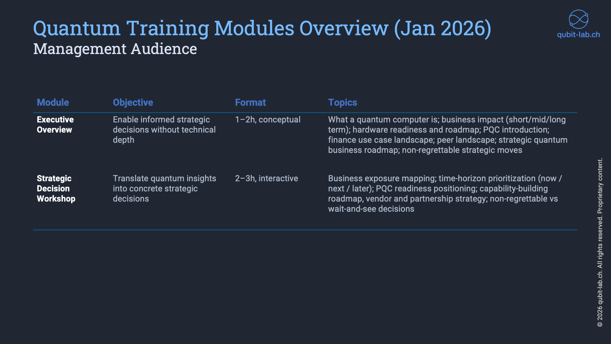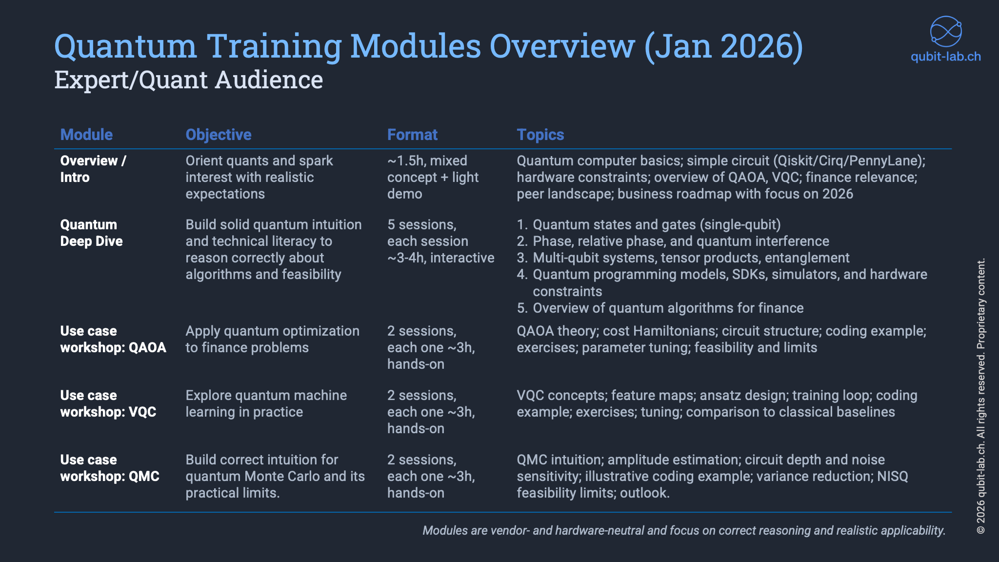 No advanced background in mathematics or physics is required. This program is designed for finance professionals, technology leaders, managers, and specialists who want to understand the business impact of quantum computing. Whether the goal is strategic awareness or practical exploration, qubit-lab provides a structured entry point.